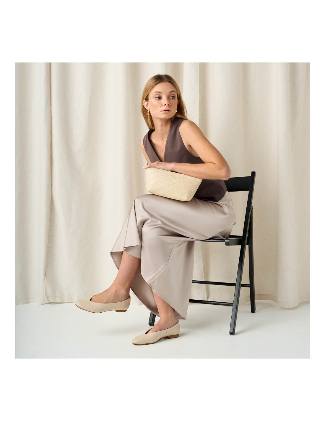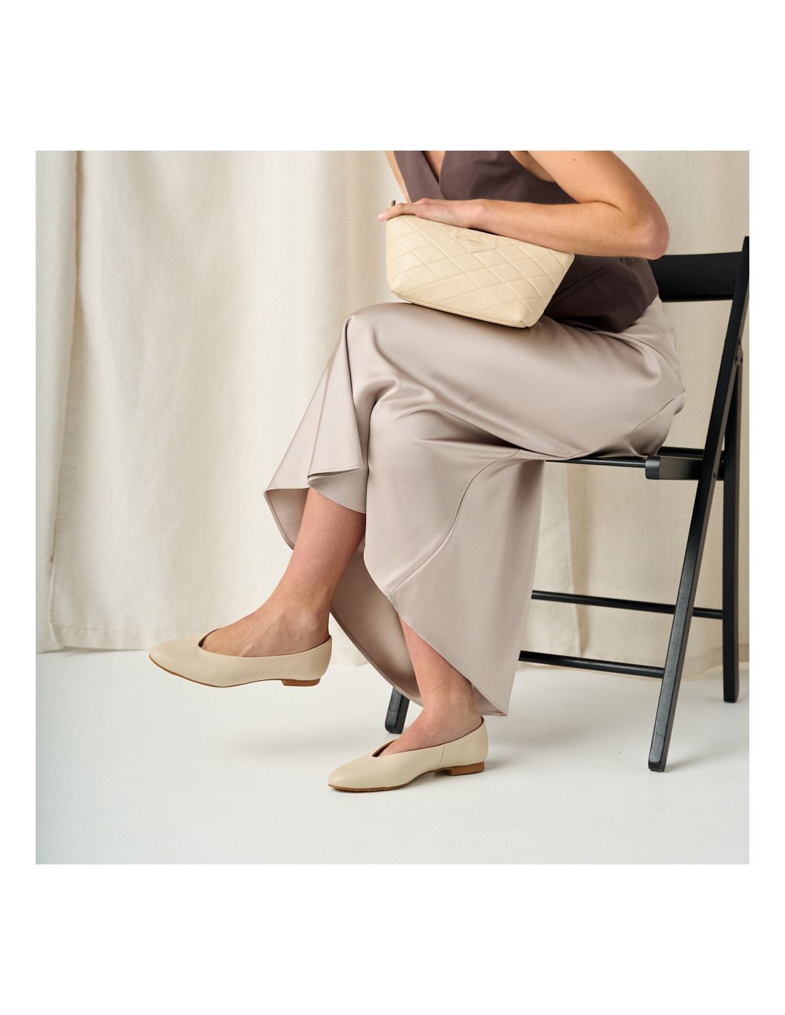 Ballerina plana na cor bege com plano médio e modelo com pernas cruzadas sentada na cadeira de perfil - MONPIEL