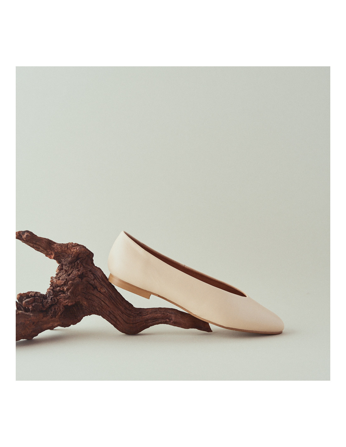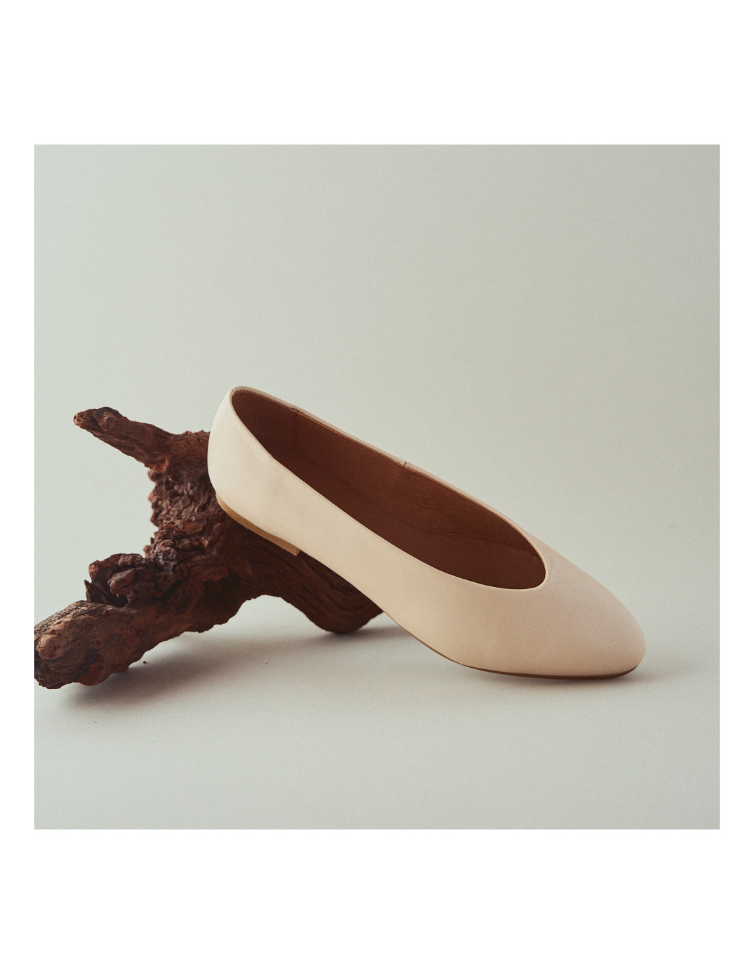 Bailarina plana na cor bege, vista de perfil, salto apoiado em um galho - MONPIEL