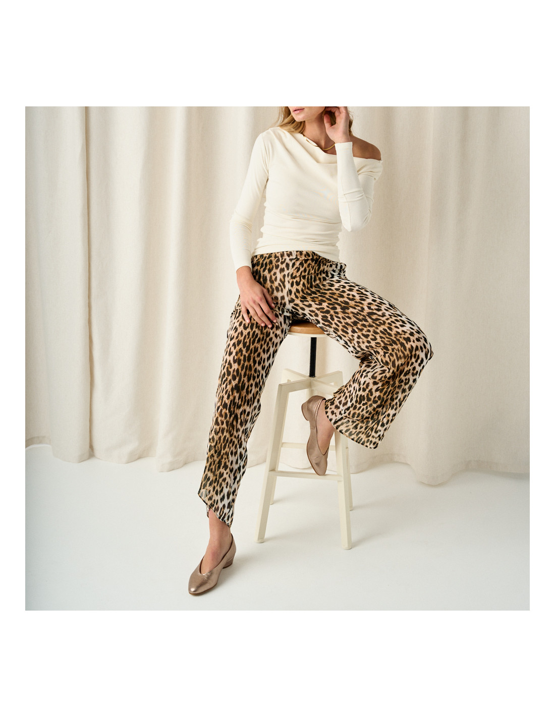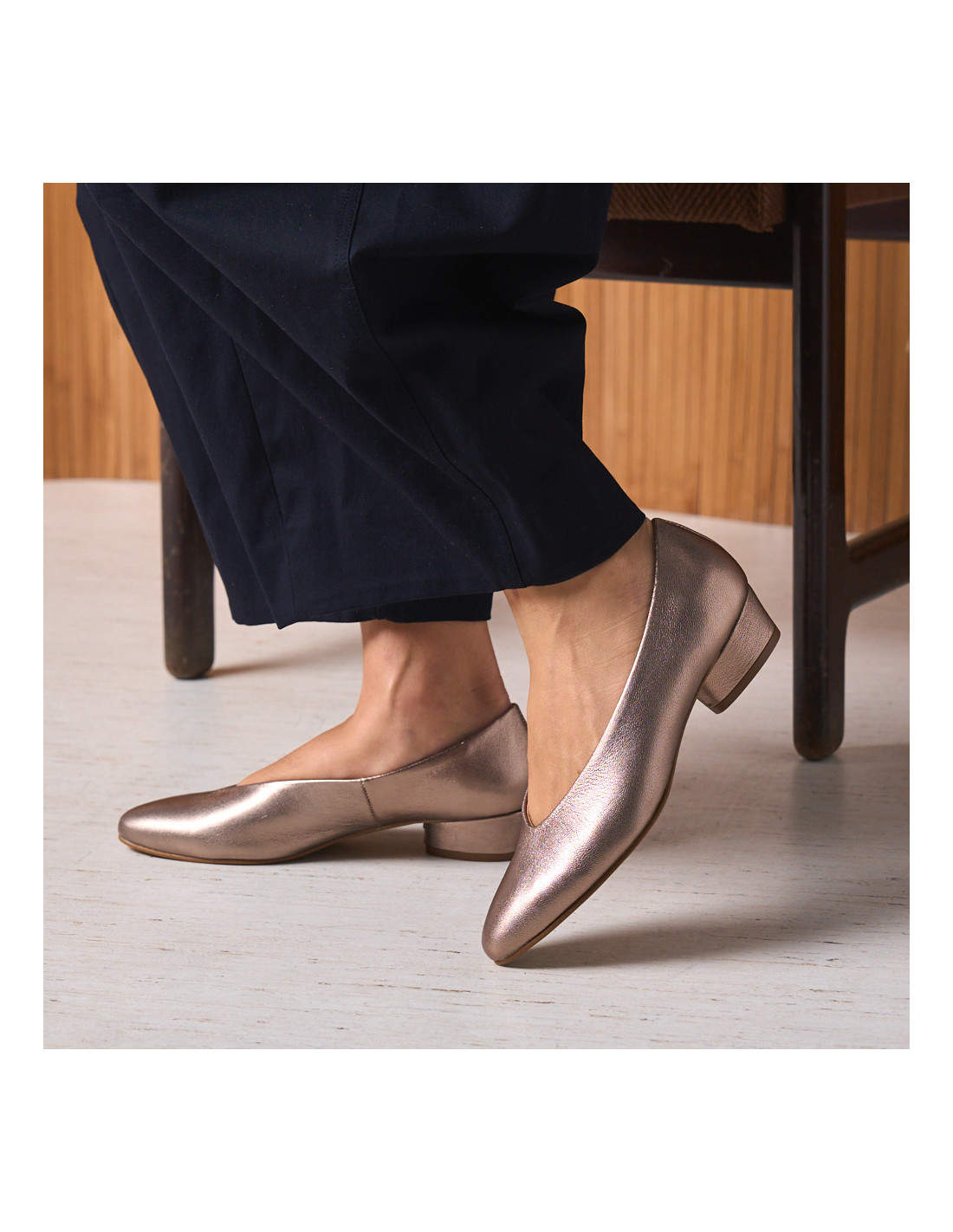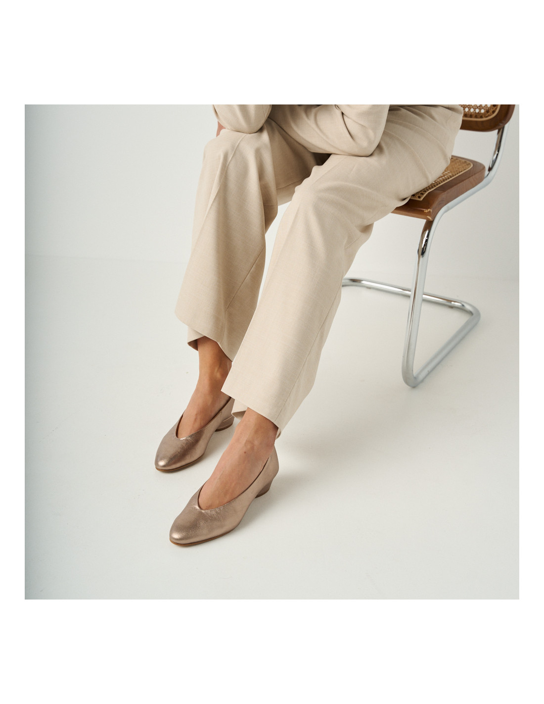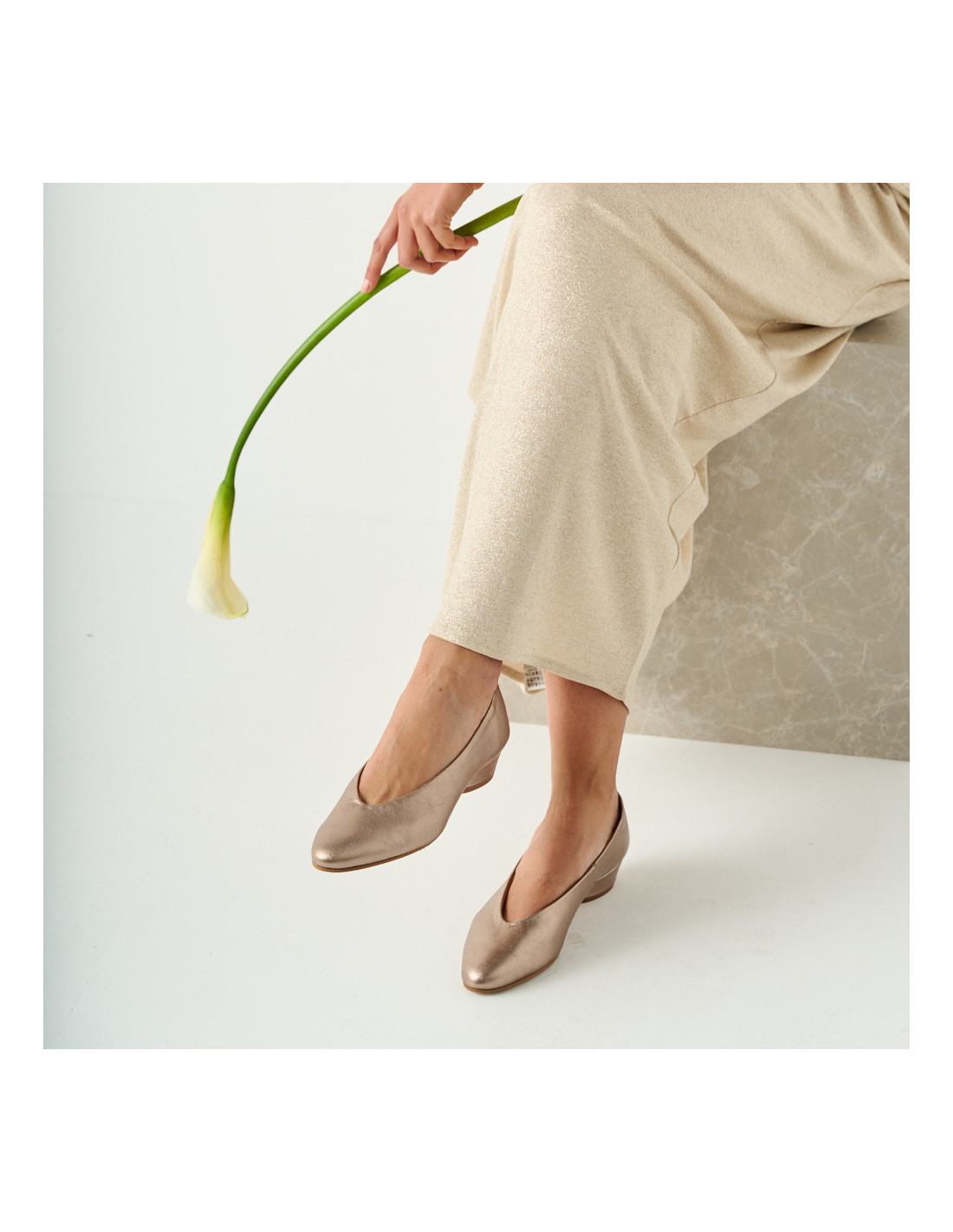 Ballerina com salto na cor cappuccino bronze com plano focado nas pernas, vista em perspectiva - MONPIEL