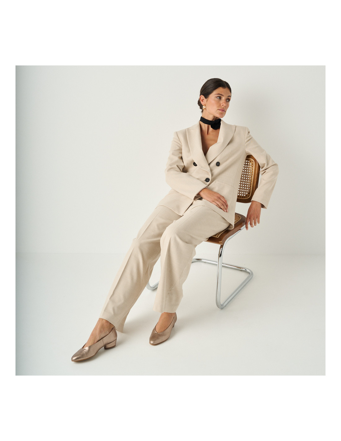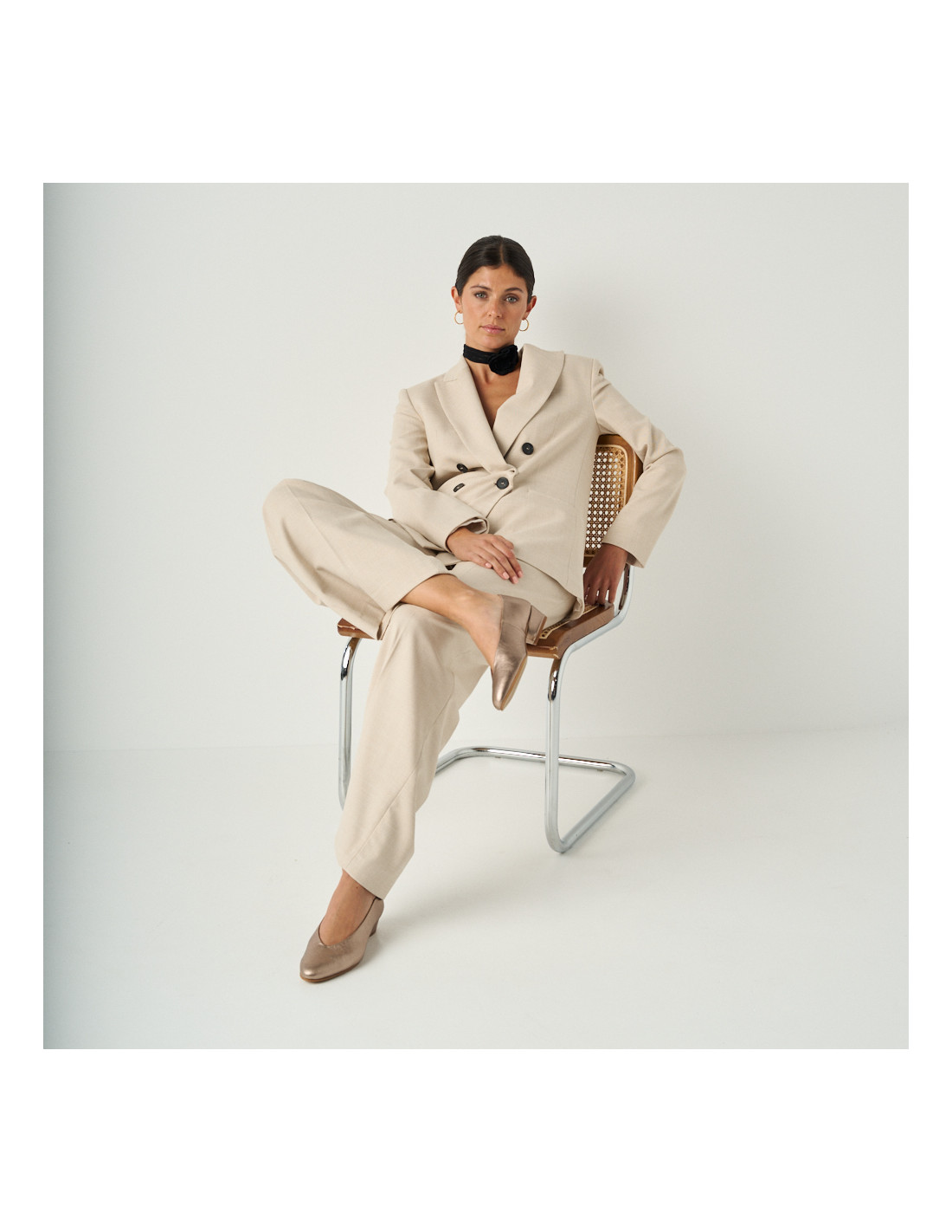 Ballerina com salto na cor cappuccino bronze com plano geral do modelo sentado na cadeira, vista em perspectiva - MONPIEL