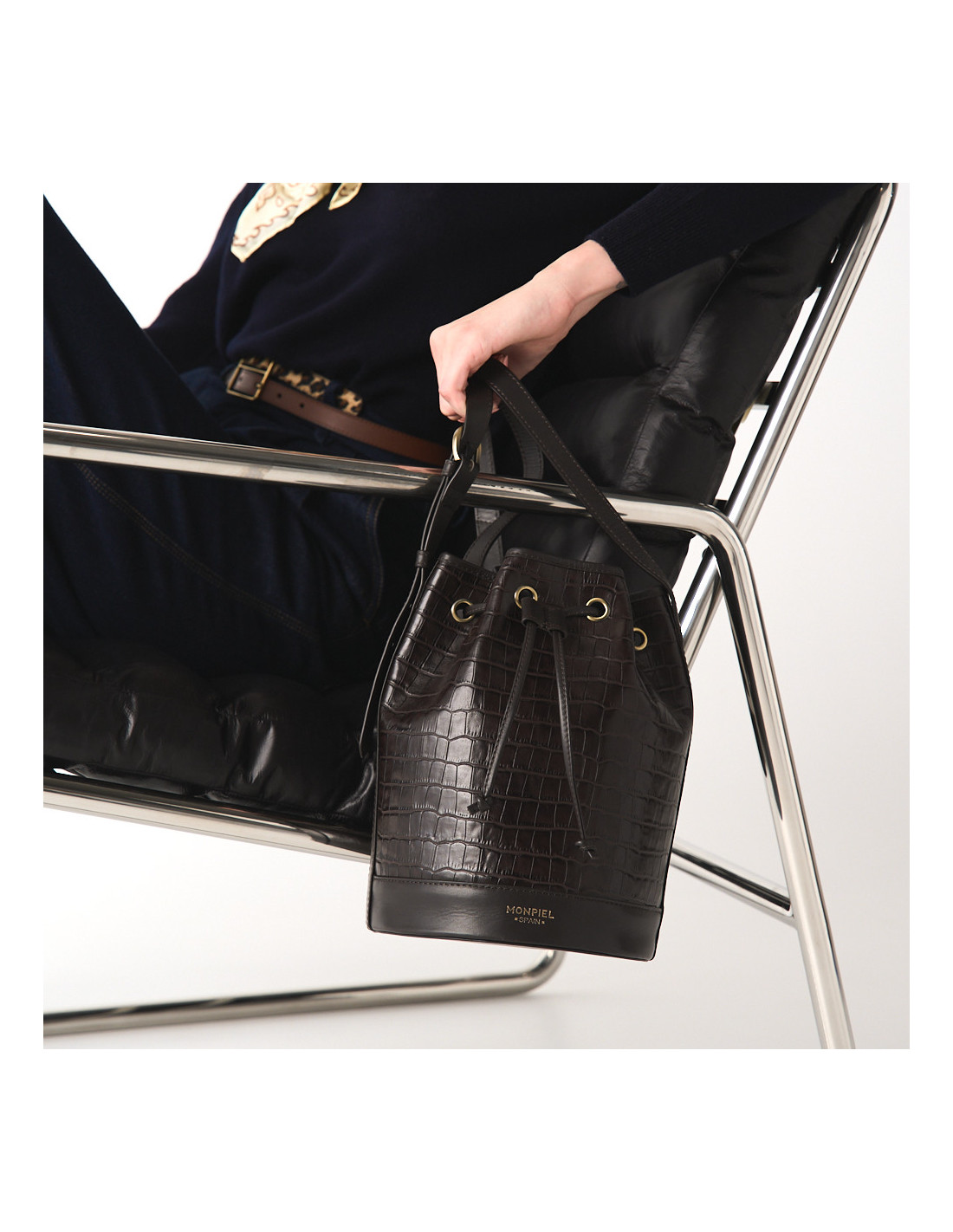 Large crocodile-patterned leather bucket bag in brown color, with a small bag beside it - MONPIEL