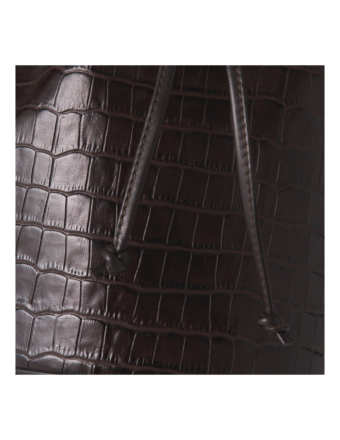 Large crocodile-patterned leather bucket bag in brown color, featuring personalization detail - MONPIEL