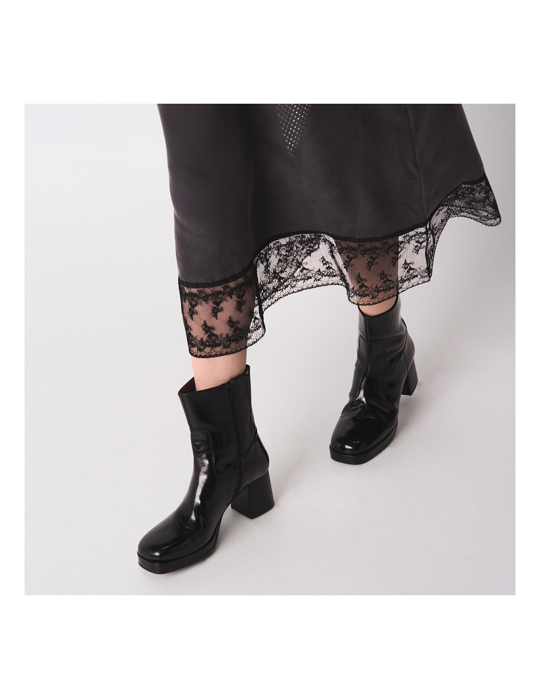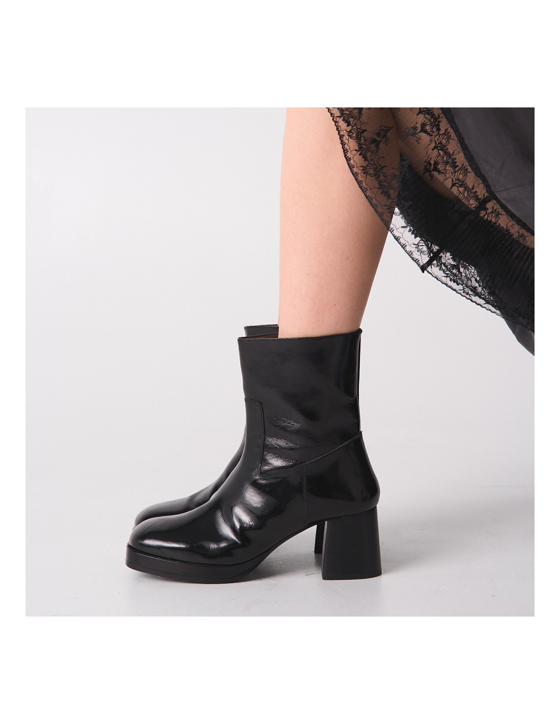 Claudia platform boot in black patent leather, perspective view, with leather handbag in hand - MONPIEL