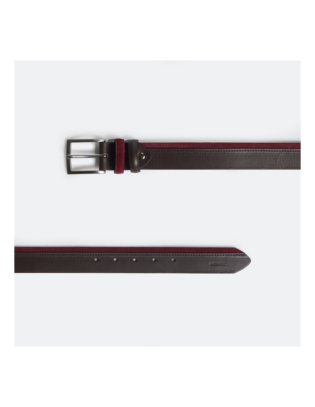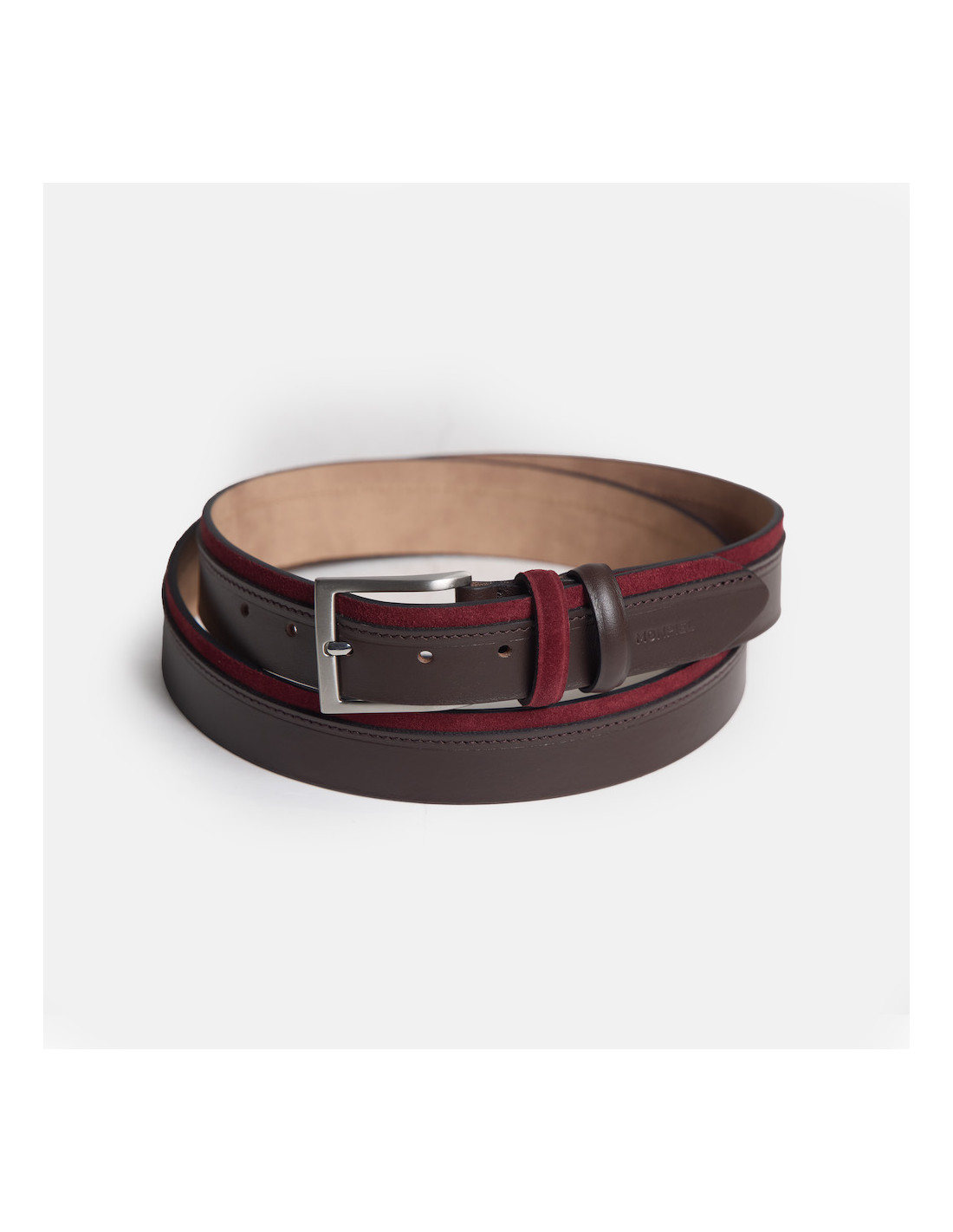 Leather belt made from a mix of cowhide and suede. This men's leather belt features a unique and innovative design, adding an elegant touch to your looks with this exclusive style. Perfect finish by the best Spanish leather artisans and a color mix that you can match daily. Handcrafted in Spain using premium quality leathers. Available in 3 colors: navy, burgundy, and Havana.