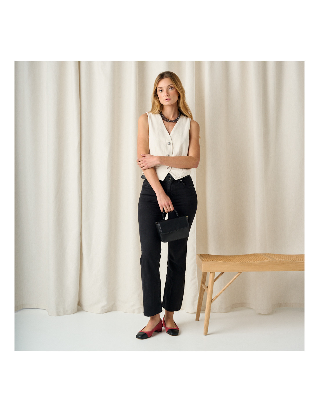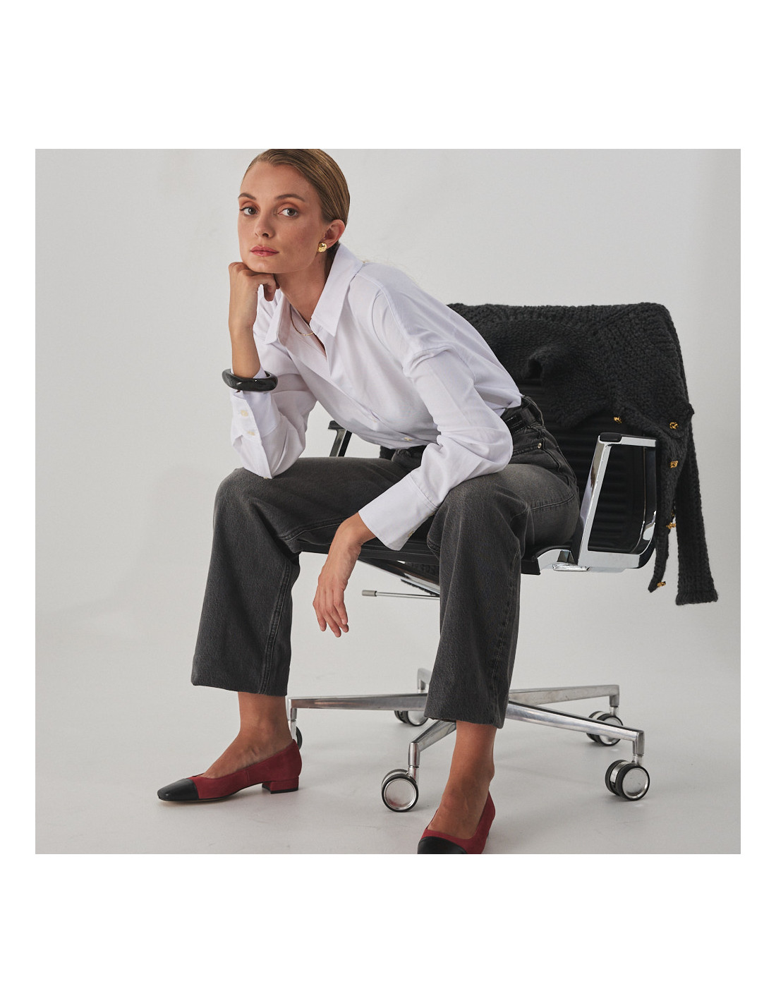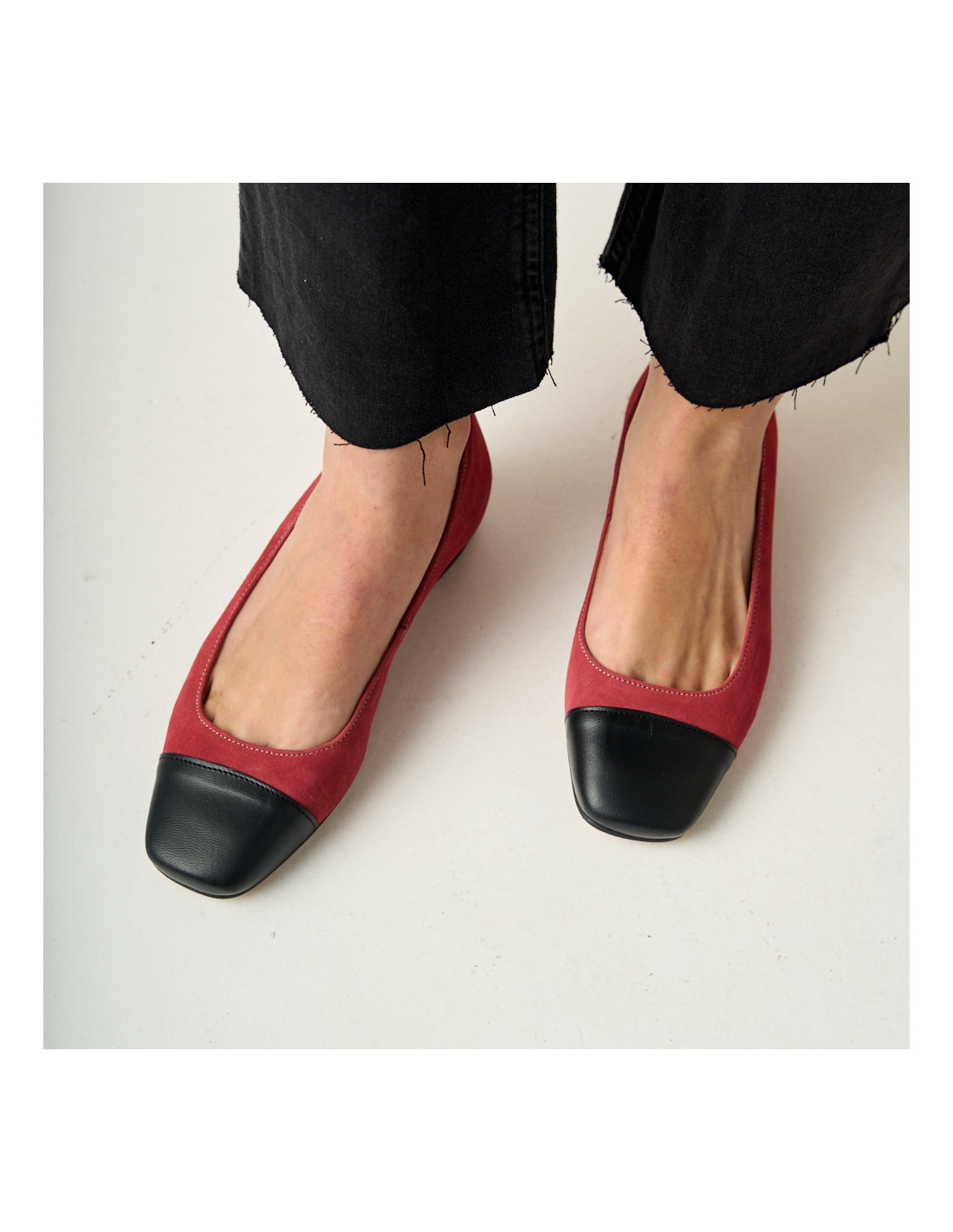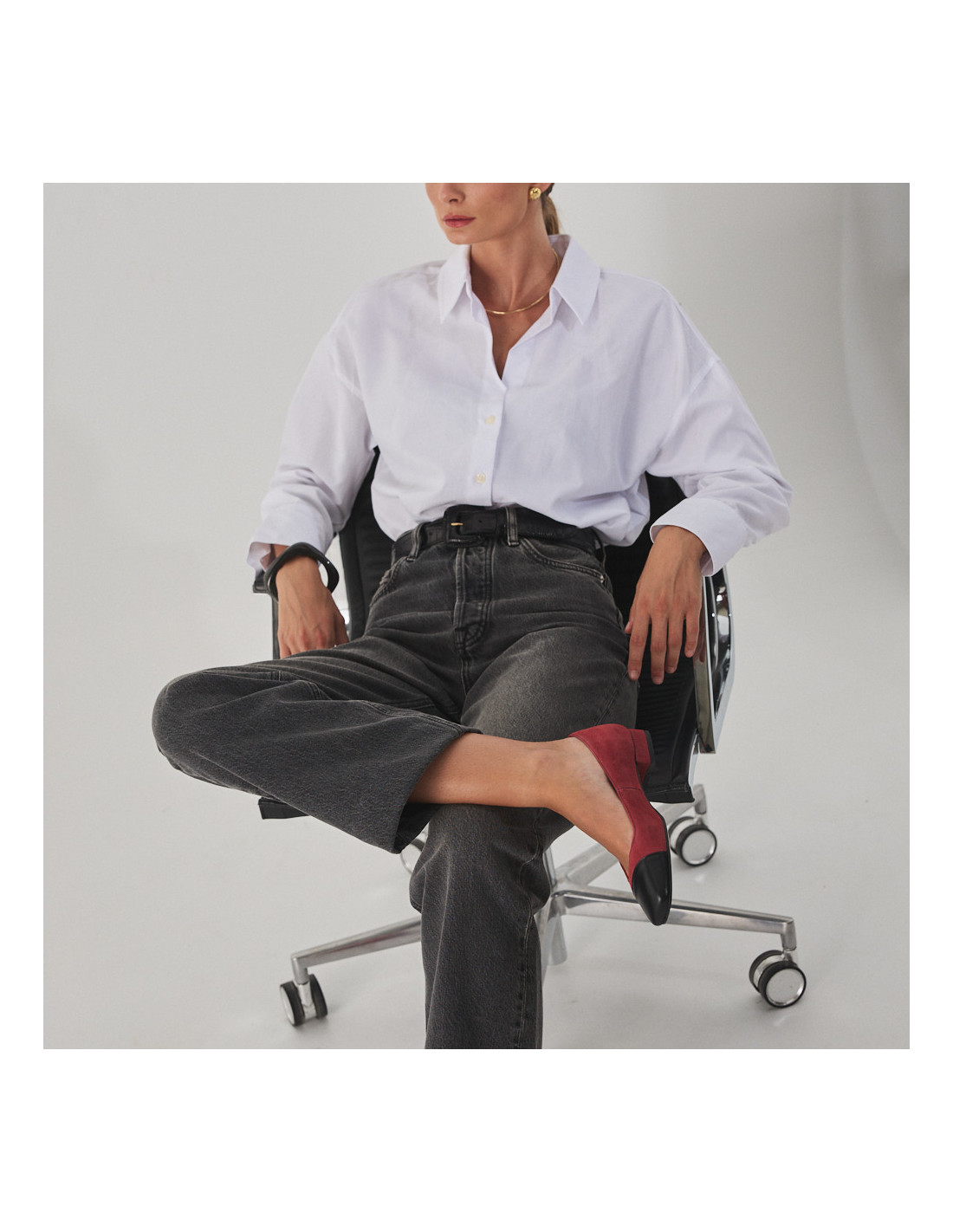 Women’s leather shoe with a square toe and bicolor design, crafted from 100% natural suede. A modern, elegant style inspired by Parisian sophistication.