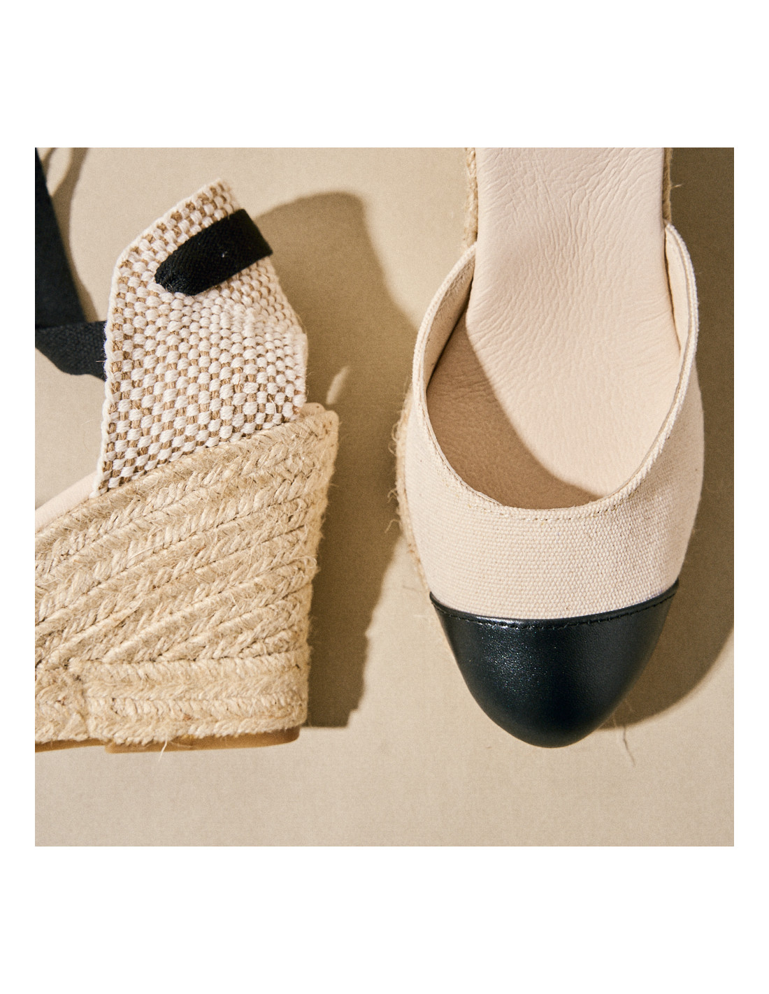 Designed in canvas fabric with a rounded toe, what makes this wedge espadrille unique is the leather toe cap, available in a metallic tone and black mother-of-pearl leather. Its closure is made with a cotton strap finished with a soft touch.