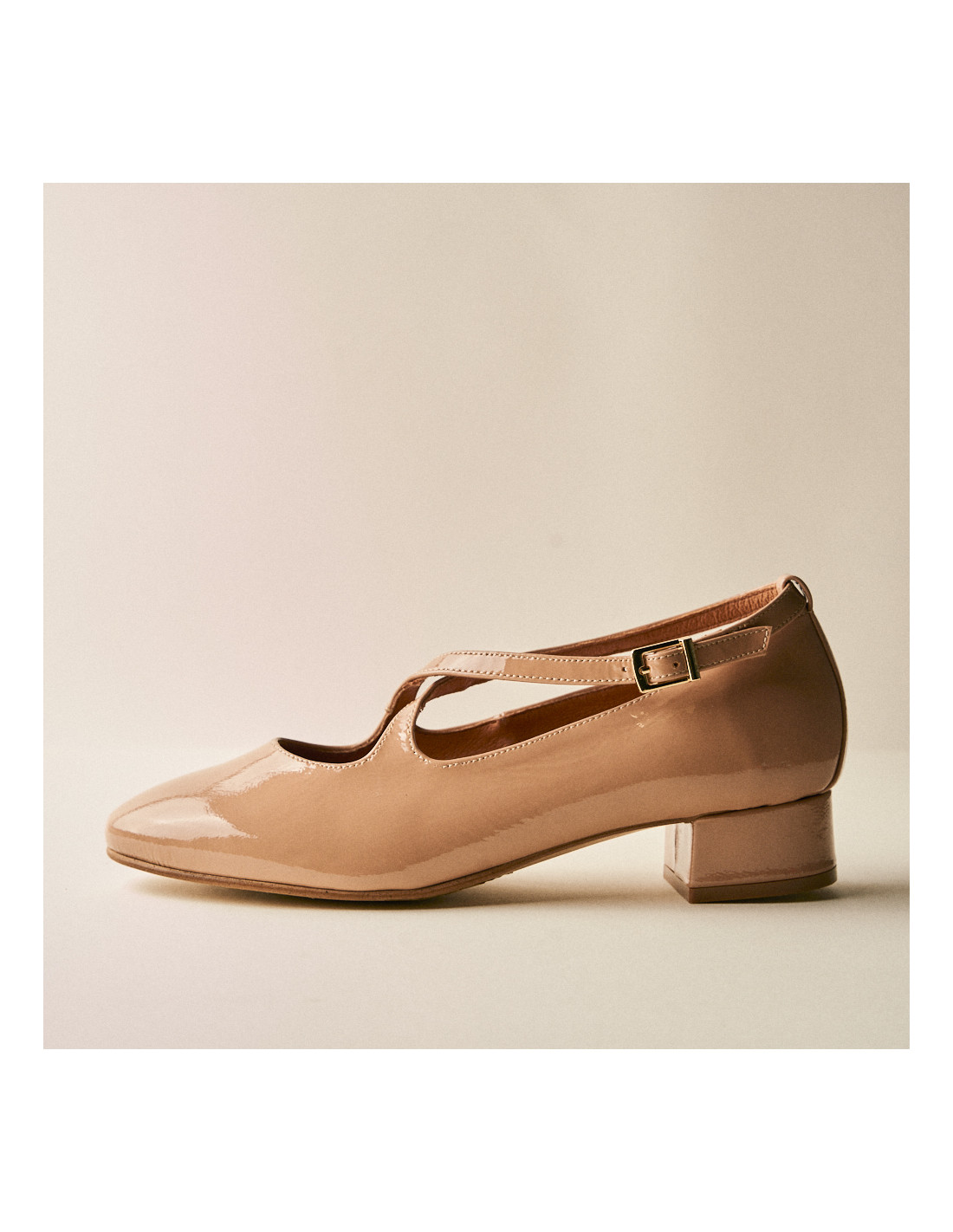 A classic with a modern and contemporary silhouette, this is our Margot Strap Mary Jane, a patent leather Mary Jane for women with a modern and contemporary shape. Its design of crossed straps over the instep defines the natural shape of the foot, providing visual balance and secure support. They are crafted in high-quality leather with a nude patent finish. This finish adds an elegant aesthetic with an ideal touch of shine. Its 3.7 cm block heel offers the perfect height without compromising stability, making it ideal for a special dinner, an important meeting, or any plan, as it allows for a full day of comfort.
